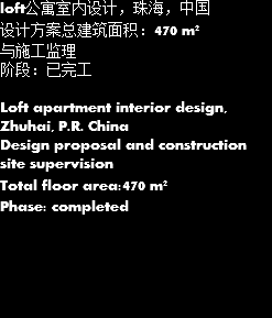 loft公寓室内设计,珠海,中国 设计方案总建筑面积:470 m² 与施工监理 阶段:已完工 Loft apartment interior design, Zhuhai, P.R. China Design proposal and construction site supervision Total floor area:470 m² Phase: completed