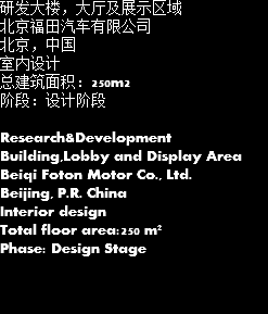 研发大楼,大厅及展示区域 北京福田汽车有限公司 北京,中国 室内设计 总建筑面积:250m2 阶段:设计阶段 Research&Development Building,Lobby and Display Area Beiqi Foton Motor Co., Ltd. Beijing, P.R. China Interior design Total floor area:250 m² Phase: Design Stage