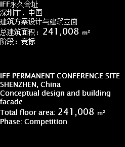 IFF永久会址 深圳市,中国 建筑方案设计与建筑立面 总建筑面积:241,008 m² 阶段:竞标 IFF PERMANENT CONFERENCE SITE SHENZHEN, China Conceptual design and building facade Total floor area: 241,008 m² Phase: Competition
