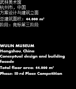 武林美术馆 杭州市,中国 方案设计与建筑立面 总建筑面积:44.000 m² 阶段:竞标第三阶段 WULIN MUSEUM Hangzhou, China Conceptual design and building facade Total floor area: 44.000 m² Phase: III-rd Place Competition
